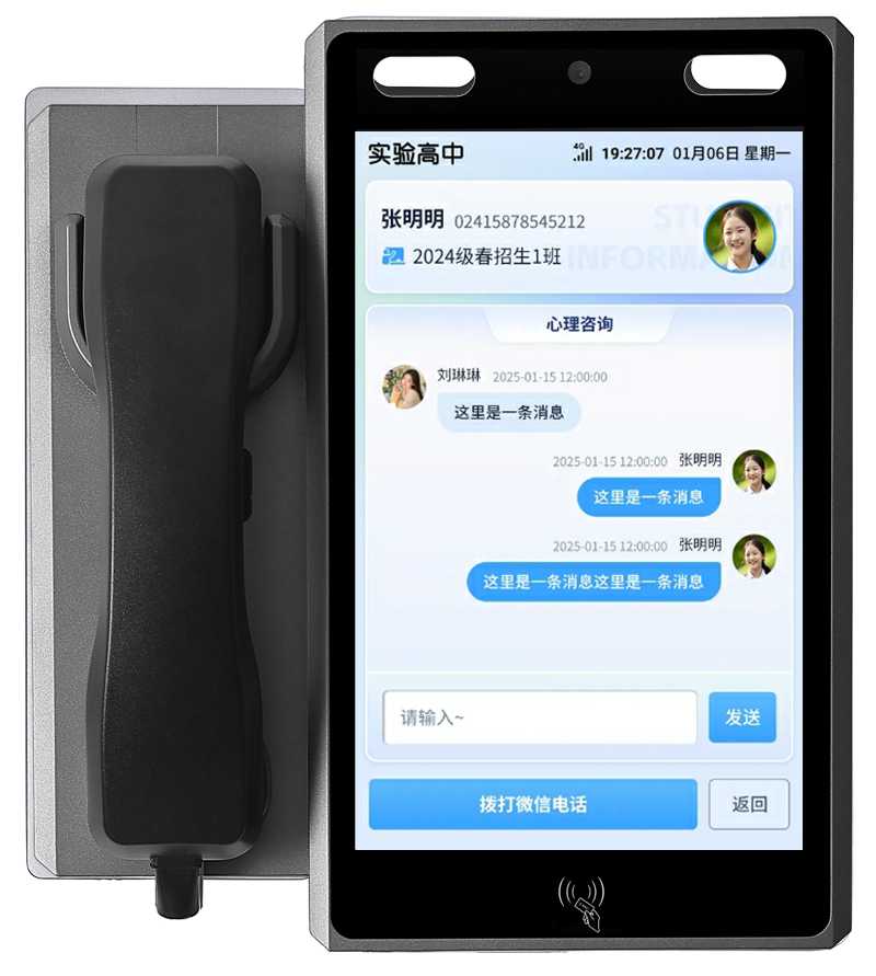 家校親情通話系統通過可視電話作為硬件載體,利用微信小程序平臺,家長無需安裝APP等操作,為學生和家長搭建音視頻通訊的橋梁,放置在教室或宿舍等多個區域,可融合人臉識別技術學生刷臉登陸,呼叫家長的電話,實現校園親情微信視頻通話連接,建立智慧信息化數字校園。
